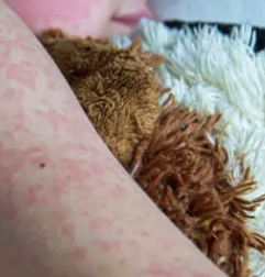 | 발진 | 작은 붉은 반점이 얼굴과 두피에서 시작해 몸과 팔다리로 퍼짐. 물집으로 변하고 딱지로 변함. |